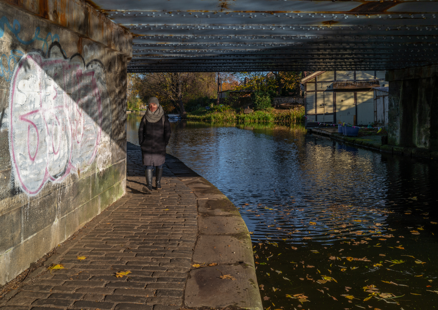 A well-timed image with subject just at the right point in the frame. Strong leading lines point to subject. Leaves on towpath add interest to foreground. RH of image distracts from the main “story”. Consider cropping out approx. 40% of RH side. Also, lighten subject slightly to emphasise the idea of subject coming into the light.